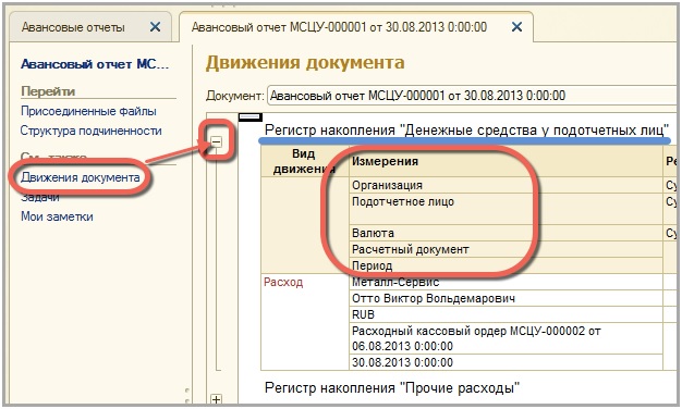 Откроем форму проведенного документа "Авансовый отчет" и посмотрим структуру регистра "Денежные средства подотчетных лиц". Для этого слева (на панели навигации) переходим к движениям документа. Справа отобразятся движения по всем регистрам. Находим необходимый нам регистр и разворачиваем его до его записей.