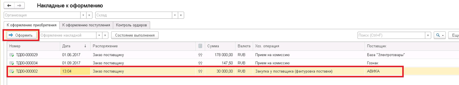 На закладке "К оформлению приобретений" находим нашу поставку и нажимаем "Оформить".